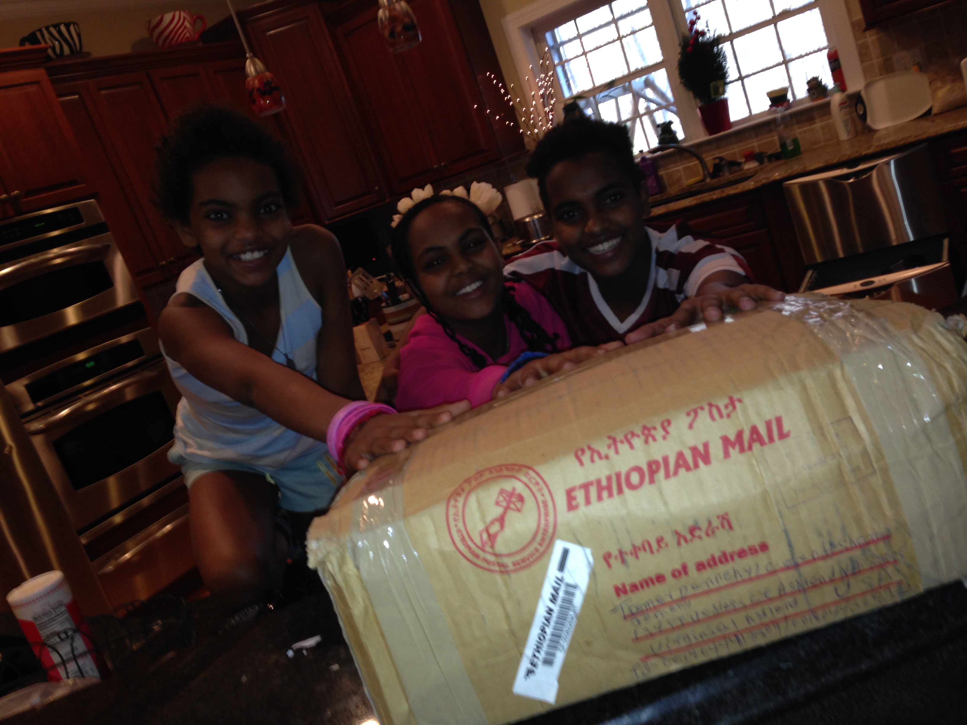 A large cardboard box, mis-shapen and crushed in spots, straining at it’s taped seams. It was stamped with an unusual red stamp and words with foreign characters. We read ETHIOPIAN MAIL in English on it’s side. And then it all made sense. Those were Amharic words and the package had made a long journey. A journey from the East of Africa, across a continent and an ocean to our doorstep in Hanover, Virginia.
